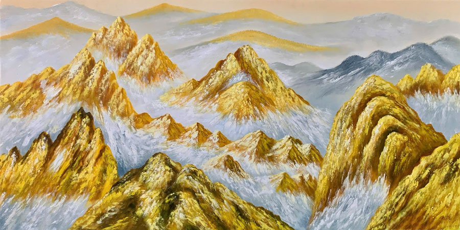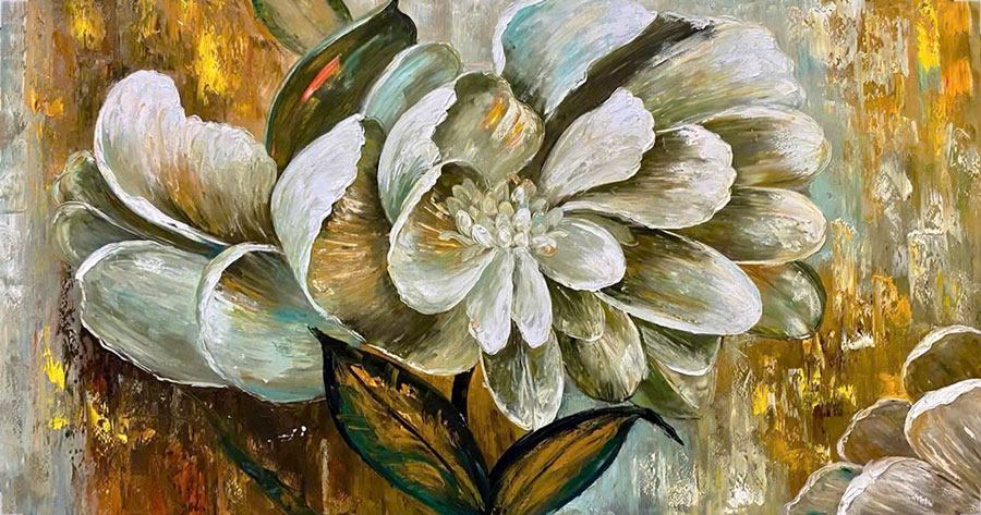 🎨 Gợi ý tranh: Tranh sơn dầu trừu tượng với sắc trắng – vàng đồng – ánh kim – xám bạc.