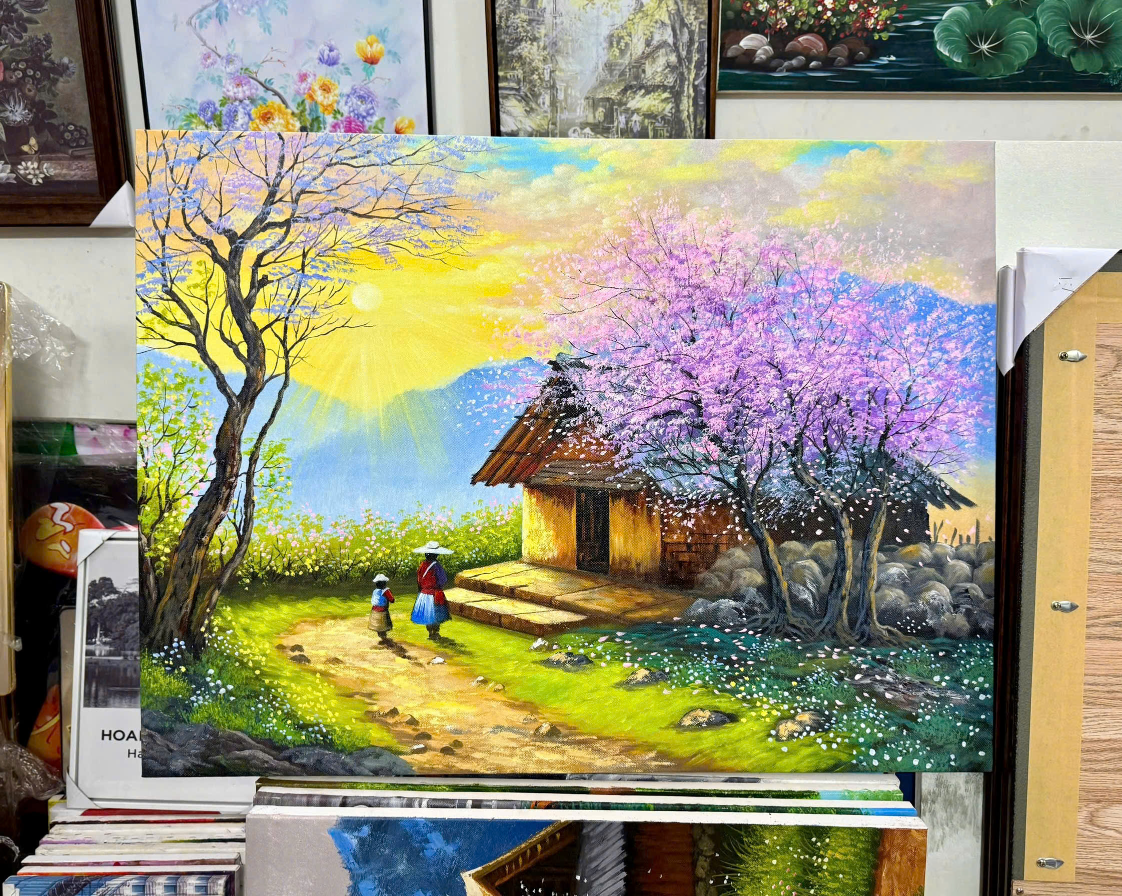 Tranh mùa xuân với hoa đào, cánh đồng hoa và sắc màu ấm áp rất được ưa chuộng. Loại tranh này đem lại cảm giác tươi mới, hy vọng và phù hợp để treo ở phòng khách hoặc lối vào nhà.