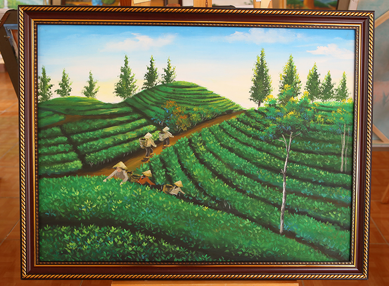 Tham khảo: Đồi chè Mộc Châu là điểm đến nổi tiếng và thường xuất hiện trong các bộ sưu tập tranh phong cảnh vùng cao.