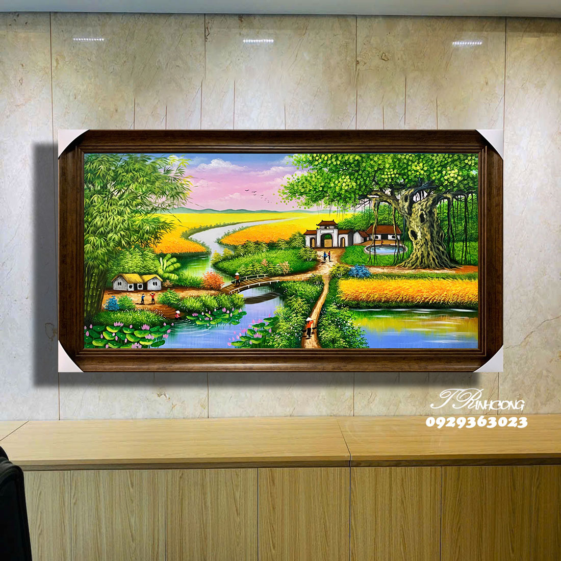Tranh Sơn Dầu Trình Công trân trọng giới thiệu đến Quý khách hàng tác phẩm “Tranh sơn dầu Bóng Đa Bến Đình SDTC105”, một bức tranh đậm chất quê hương Việt Nam, tái hiện khung cảnh làng quê yên bình với cây đa cổ thụ, cổng đình làng, dòng sông uốn lượn và con đường làng mộc mạc. Đây không chỉ là một tác phẩm nghệ thuật, mà còn là ký ức, là tâm hồn, là nơi mỗi người tìm thấy sự bình yên sau những ngày mỏi mệt chốn thị thành.