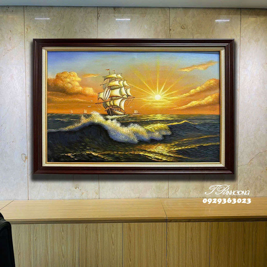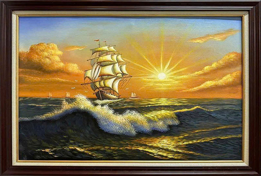 Bức tranh tái hiện khoảnh khắc bình minh trên biển lớn, khi mặt trời vừa nhô lên khỏi đường chân trời, lan tỏa ánh sáng vàng rực khắp không gian. Con thuyền buồm hiện lên đầy uy nghi giữa những con sóng cuộn trào, cánh buồm căng gió như đang thức dậy cùng ánh nắng đầu ngày, sẵn sàng cho một hải trình mới.
