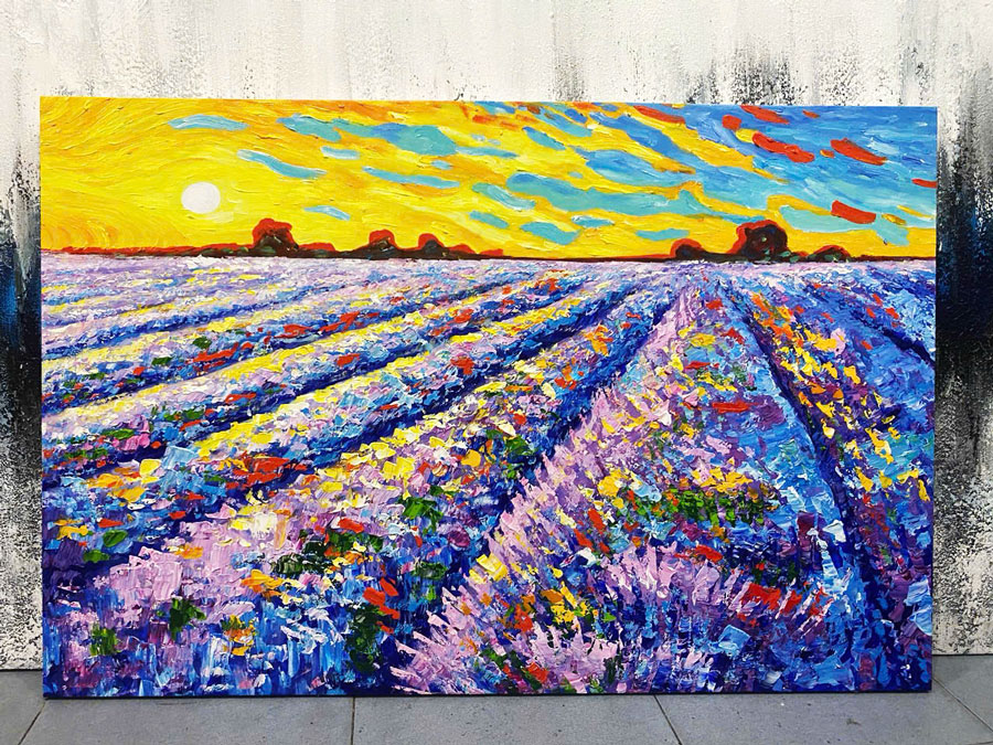 Chất liệu: Bức tranh “Cánh Đồng Tím” được thực hiện bằng sơn dầu cao cấp trên nền vải bố (canvas) nhập khẩu, đảm bảo độ bền màu và độ tươi sáng lâu dài theo thời gian. Chất liệu này không chỉ bền chắc mà còn giúp bức tranh thể hiện được chiều sâu màu sắc, đem lại cảm giác sống động, tinh tế.