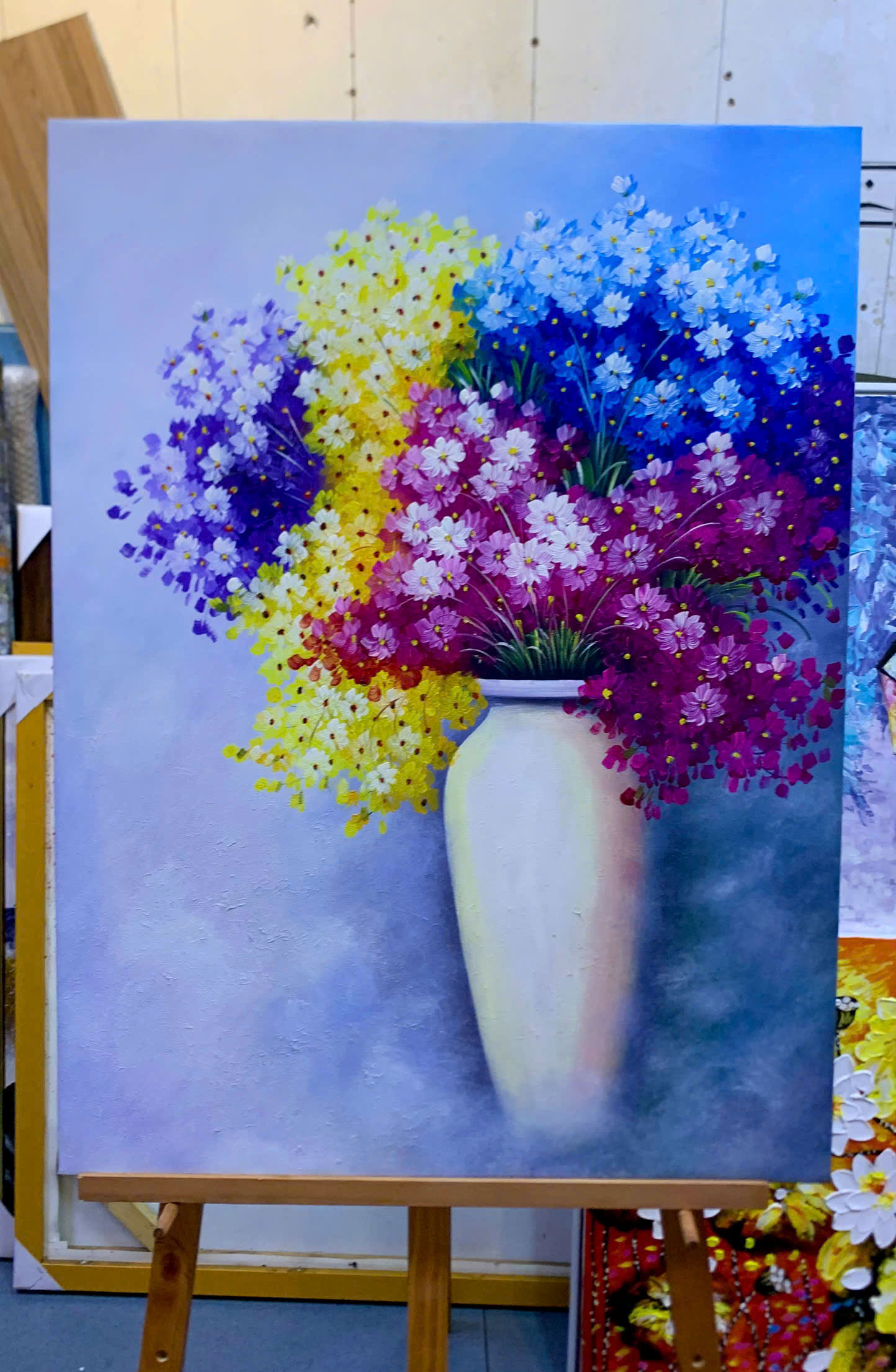 Bức tranh được vẽ tay hoàn toàn bằng sơn dầu trên vải bố, từng lớp màu được xử lý khéo léo để tạo chiều sâu và độ mềm mại cho cánh hoa. Sự kết hợp của các gam màu vàng, tím, xanh, hồng mang đến cảm giác mùa xuân lan tỏa, nhưng vẫn giữ được nét trầm lắng đặc trưng của dòng tranh tĩnh vật.