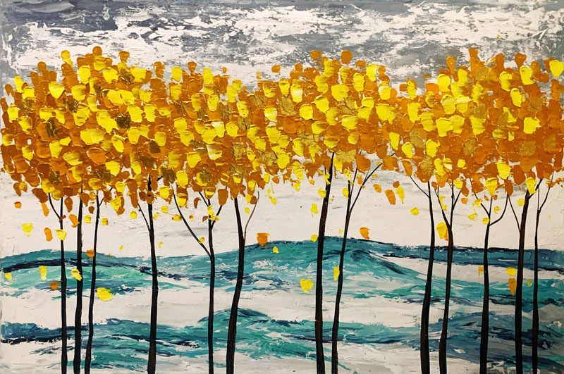 Kỹ thuật sơn dầu đắp nổi: Từng mảng màu được họa sĩ tạo khối nổi bật, mang lại hiệu ứng 3D chân thực. Người xem có thể cảm nhận rõ từng chi tiết, từ sắc vàng của lá thu đến bầu trời xám nhẹ nhàng.