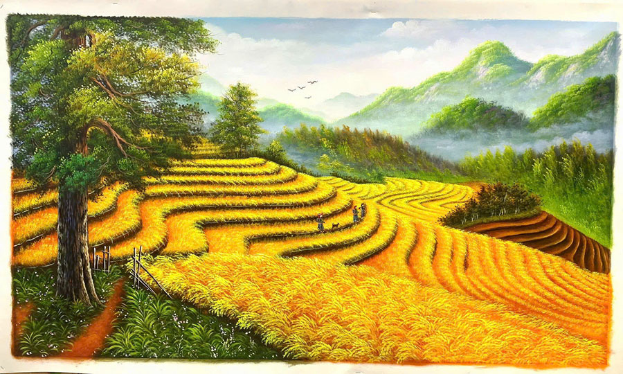 Tranh sơn dầu Mùa Vàng Tây Bắc SDTC87 tại Trình Công Decor được vẽ bằng tay 100% bằng màu sơn dầu