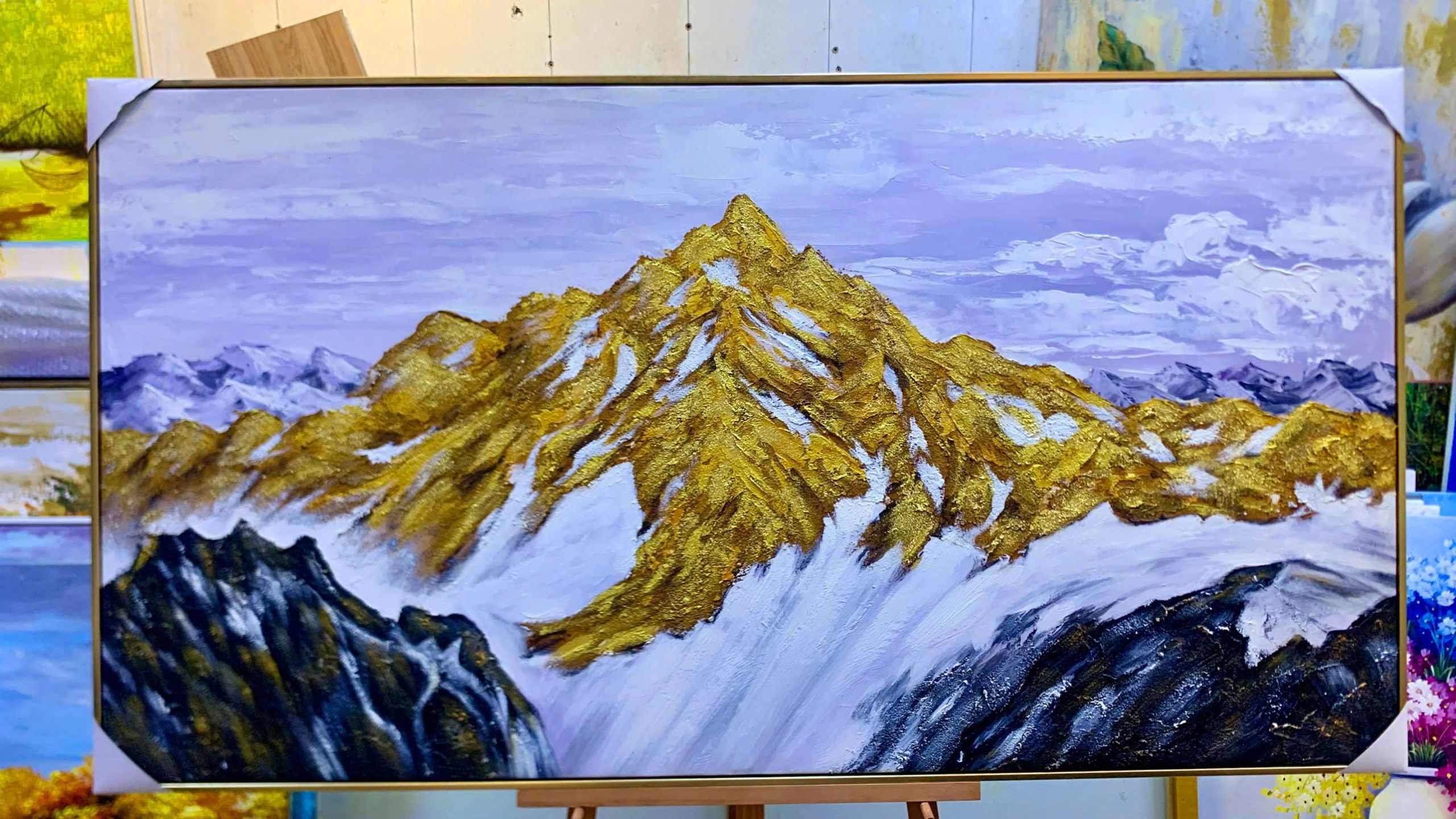 Hình tượng núi ngũ hành và sắc vàng rực rỡ đại diện cho Kim sinh Thủy, Thủy sinh Mộc, kích hoạt nguồn năng lượng thịnh vượng. Bức tranh không chỉ là nghệ thuật, mà còn mang thông điệp vững chãi như núi, giàu sang như vàng, thu hút tài khí – vượng khí vào ngôi nhà.