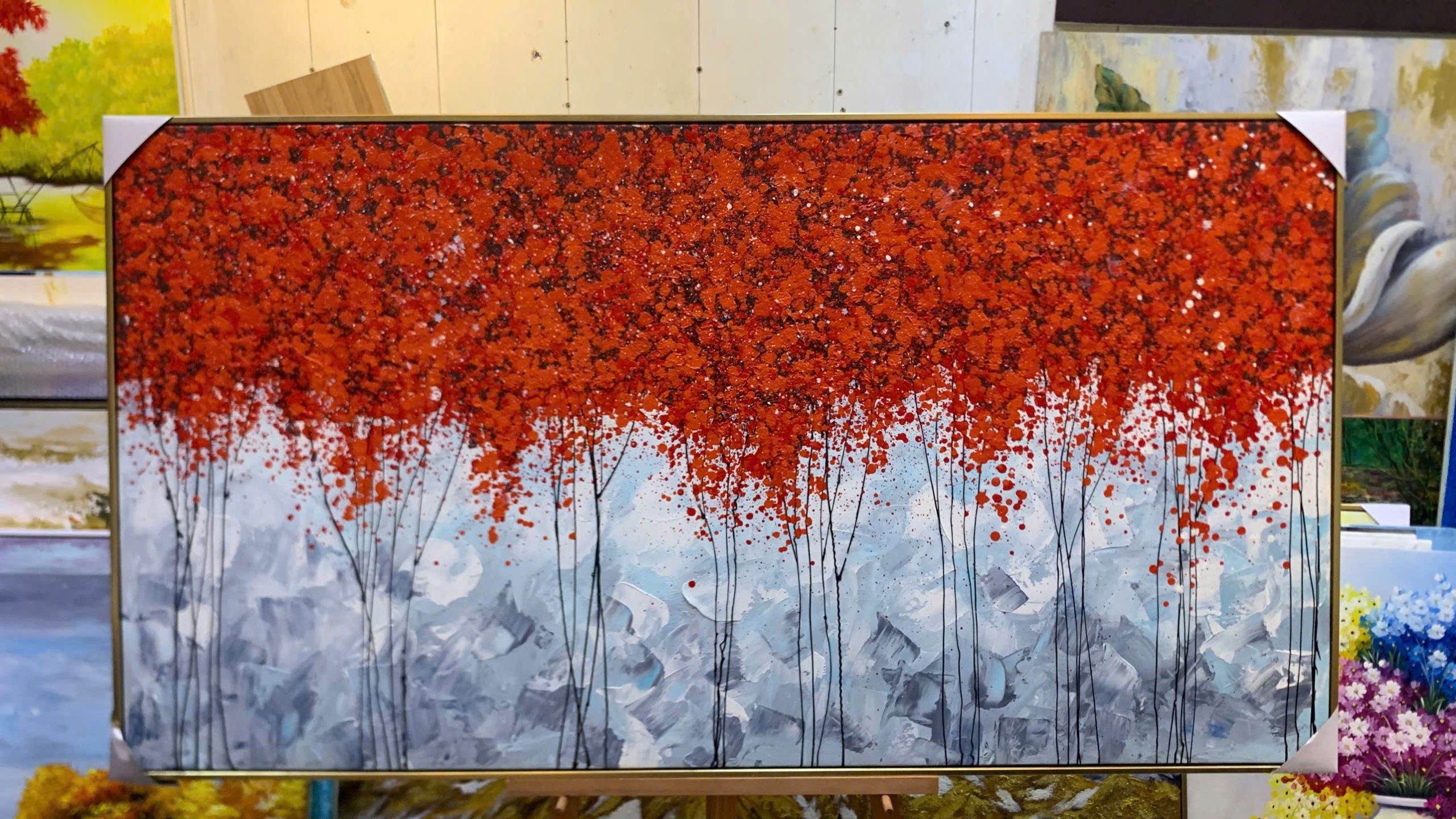 Khám phá tranh sơn dầu Rừng Thu Đỏ Lửa SDTC120 thuộc bộ sưu tập hoa nghệ thuật trừu tượng. Tác phẩm vẽ tay bằng sơn dầu cao cấp, gam đỏ rực rỡ mang ý nghĩa phong thủy, phù hợp trang trí phòng khách, phòng làm việc và không gian sang trọng.