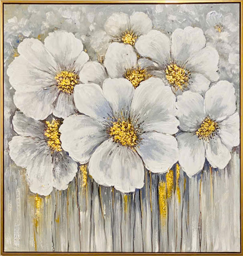 Bức tranh gây ấn tượng với nền hoa trắng thanh khiết kết hợp cùng nét dát vàng nổi bật, tạo điểm nhấn lấp lánh như ánh nắng đầu ngày. Mỗi cánh hoa được họa sĩ xử lý bằng chất liệu sơn dầu cao cấp, tạo hiệu ứng nổi và chiều sâu sống động, phù hợp với những không gian đề cao sự tinh tế và thư thái.
