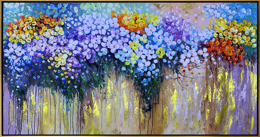 Nghệ thuật trừu tượng hoa là cách mà người nghệ sĩ thể hiện cảm xúc nội tâm thay vì tái hiện thực tế. Trong bức tranh này, từng đường nét đều tự do, phóng khoáng – thể hiện tinh thần sáng tạo không giới hạn. Các mảng màu được đắp nổi bằng sơn dầu tạo chiều sâu, giúp bề mặt tranh có hiệu ứng 3D độc đáo, khiến người xem có cảm giác như những cánh hoa đang thực sự chuyển động.